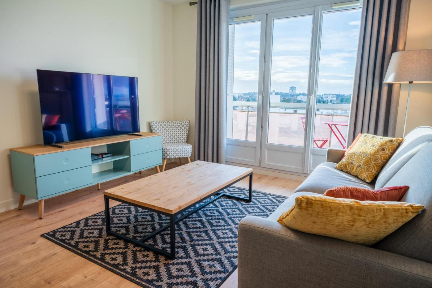 Appartement 1 Chambre. This apartment consists of 1 living room, 1 separate bedroom and 1 bathroom with a shower and free toiletries. The fully equipped kitchen features a stovetop, a refrigerator, a dishwasher and kitchenware. The air-conditioned apartment provides a flat-screen TV with streaming services, a washing machine, soundproof walls, a tea and coffee maker as well as city views. The unit offers 2 beds.
