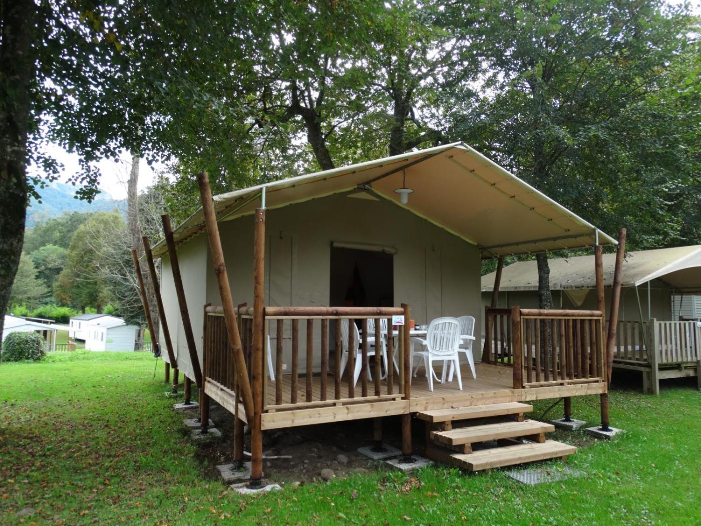 Tente. Guests can make meals in the kitchenette that is fitted with a stovetop, a refrigerator, kitchenware and a microwave. This tent has a seating area, a terrace, garden views and a shared bathroom. The unit has 3 beds. ;