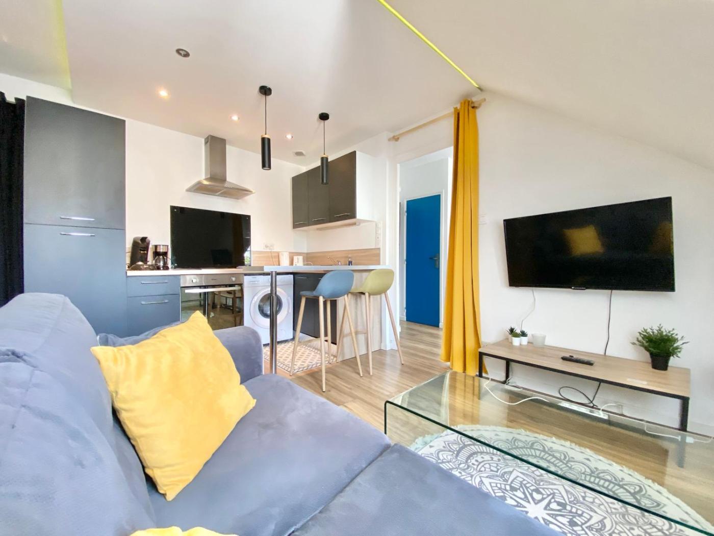 Appartement 1 Chambre. This apartment is comprised of 1 living room, 1 separate bedroom and 1 bathroom with a shower and a hairdryer. The well-equipped kitchen features a stovetop, a refrigerator, kitchenware and an oven. The apartment offers a flat-screen TV with cable channels, a washing machine, soundproof walls, a tea and coffee maker as well as city views. The unit offers 2 beds.
